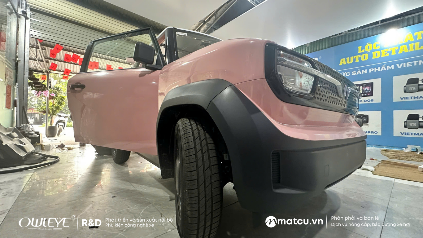 Lấy ví dụ về mẫu Vf3 mà Mắt Cú đang thi công: Chị chủ xe đã yêu cầu bọc lại toàn bộ ghế da màu hồng phấn – đồng màu hoàn hảo với lớp sơn ngoại thất của xe. Sự kết hợp này tạo nên không gian nội thất cực kỳ “nàng thơ”, ngọt ngào nhưng không kém phần đẳng cấp. Da cao cấp không chỉ bền mà còn mang lại cảm giác ngồi thoáng mát, dễ dàng lau chùi.